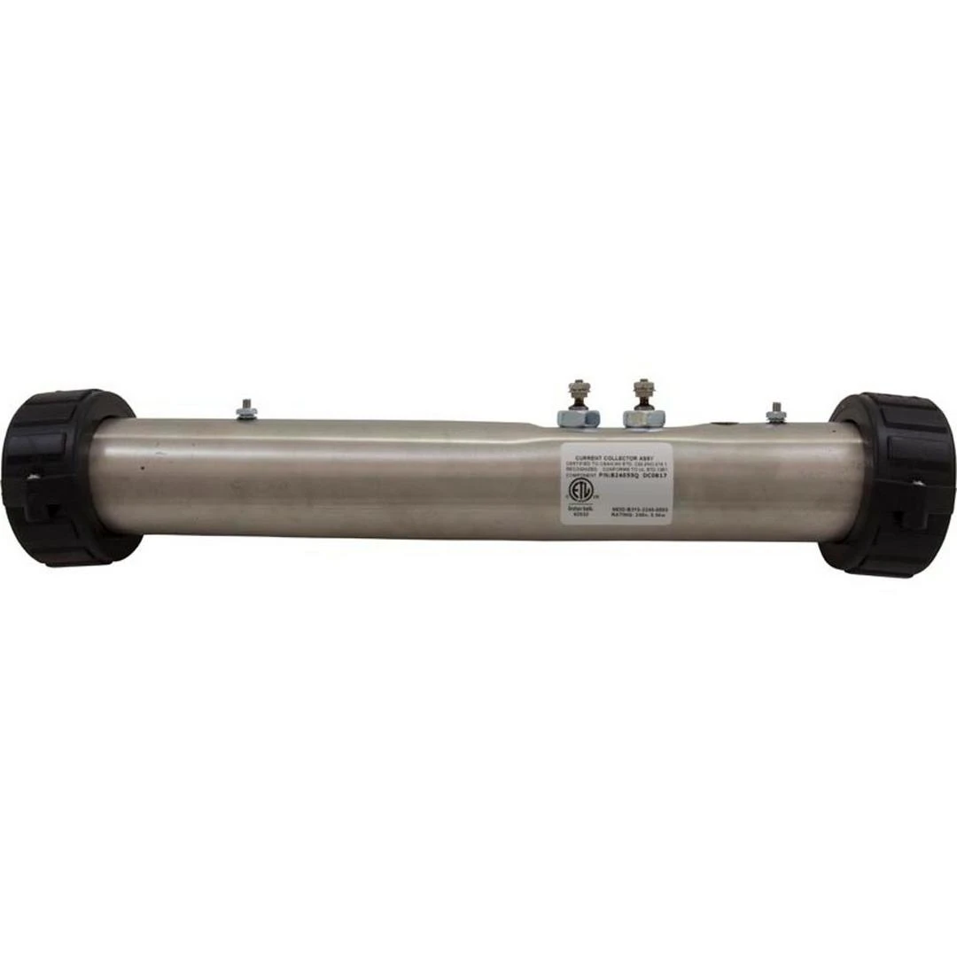 Flo-Thru spa heater replacement B24055R is a generic 15″”, 5.5 kW, 240V, used on Len Gordon, Spa Builders, and Pinnacle Universal and PCU spa packs. Flow Thru spa heater by Spa Components, B24055-Q, labeled as Heater Current Collector Assembly, includes Incoloy coated heater element, unions not included.
